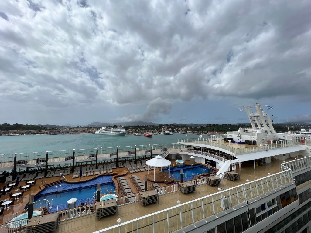 On May 16th we sailed into the port of Corfu, Greece. A couple things of note about this arrival. One, the weather was complete crap. It was raining like mad. Two, we docked next to another ship. Given our stateroom location, if went onto our balcony it felt like we could toss something to the folks on the other ship (which, to be clear, we did NOT attempt).