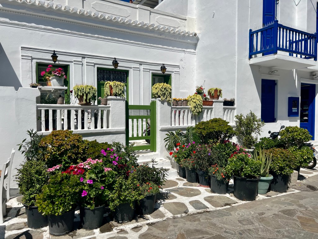 This patio had a gorgeous mosaic, made from stones that were laid on their side.This resident made their own green space with plants and trim paint – and you can see the bright blue accents on the home next door. The contrast in the colors is striking.Sara and Drake – Mykonos