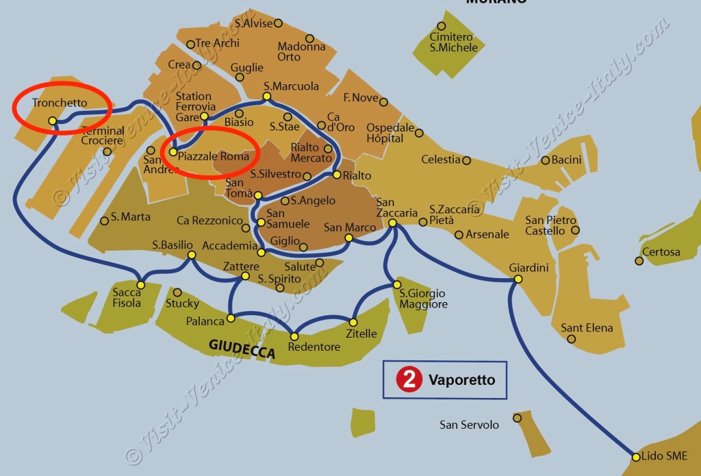 Because we were staying a few days, we bought a 3-day ACTV pass (water bus). This enabled us to hop on/hop off and get around the city and other islands quite easily. Just make sure you look at the sign to know where you are and which direction you want to go. Worst case scenario if you get on the wrong one, you have a nice long ride around the Grand Canal if you’re going the long way around! Below is a map for the #2 line. I’ve circled the Piazzale Roma and Tronchetto locations in red. You can take the Vaporetto to P.Roma and then the People Mover is a short walk – with signs marking the way.